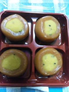 今日のおやつにです。真ん中にサツマイモあんと黒胡麻が・・・。